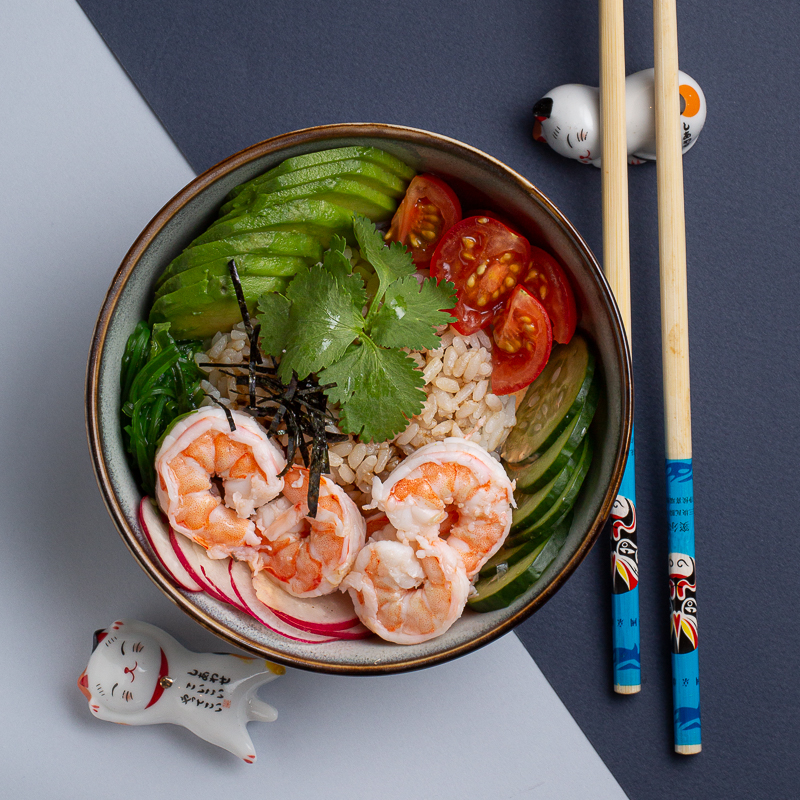 Креветки, рис, помидоры черри, редис, салат чука, огурец, авокадо, нори, соус спайс, соус сашими.