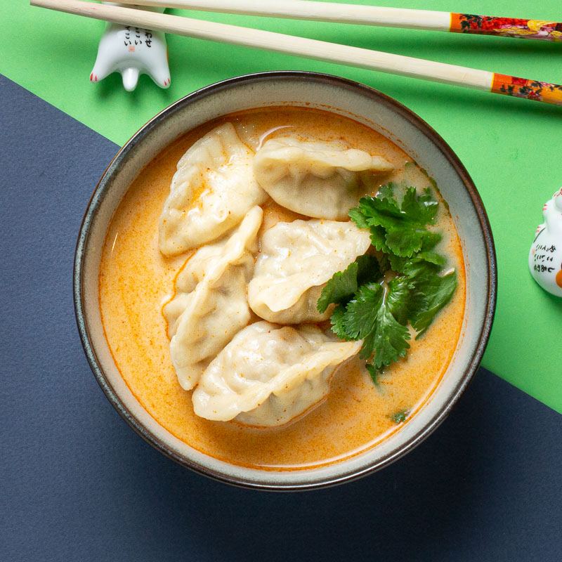 Китайские пельмени с креветкой Цзяоцзы, бульон Том Ям, лук зелёный, листья лайма.