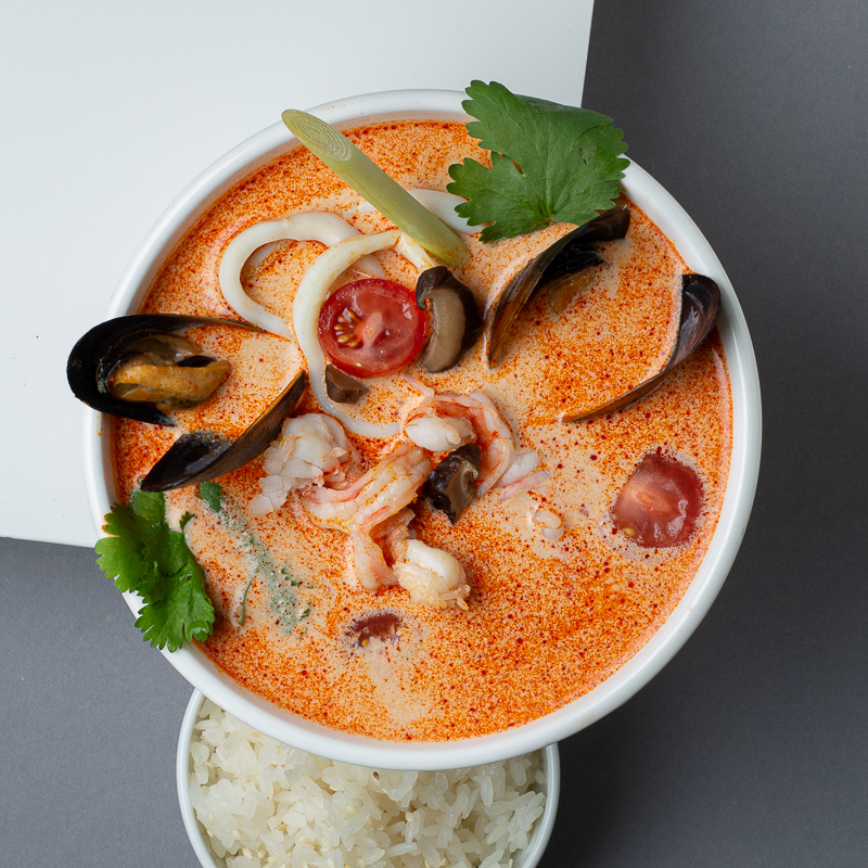 Бульон том ям, кальмар, креветка, грибы шиитаке, помидоры черри, лемонграсс, лук зелёный, рис, кунжут.