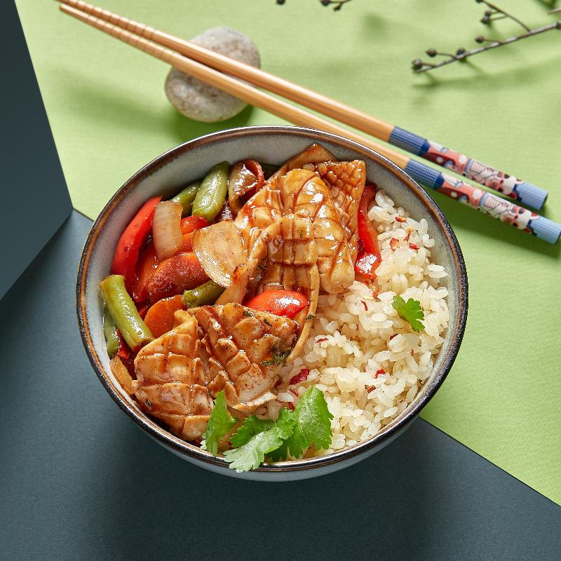 Кальмар, рис, болгарский, лук репчатый, фасоль, морковь, соус кисло-сладкий лук зелёный.