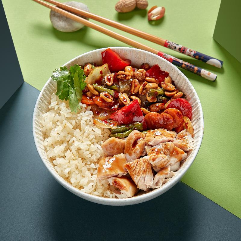 Курица, арахис, рис, болгарский, фасоль, лук репчатый, морковь, соус устричный с добавлением чили, лук зелёный.
